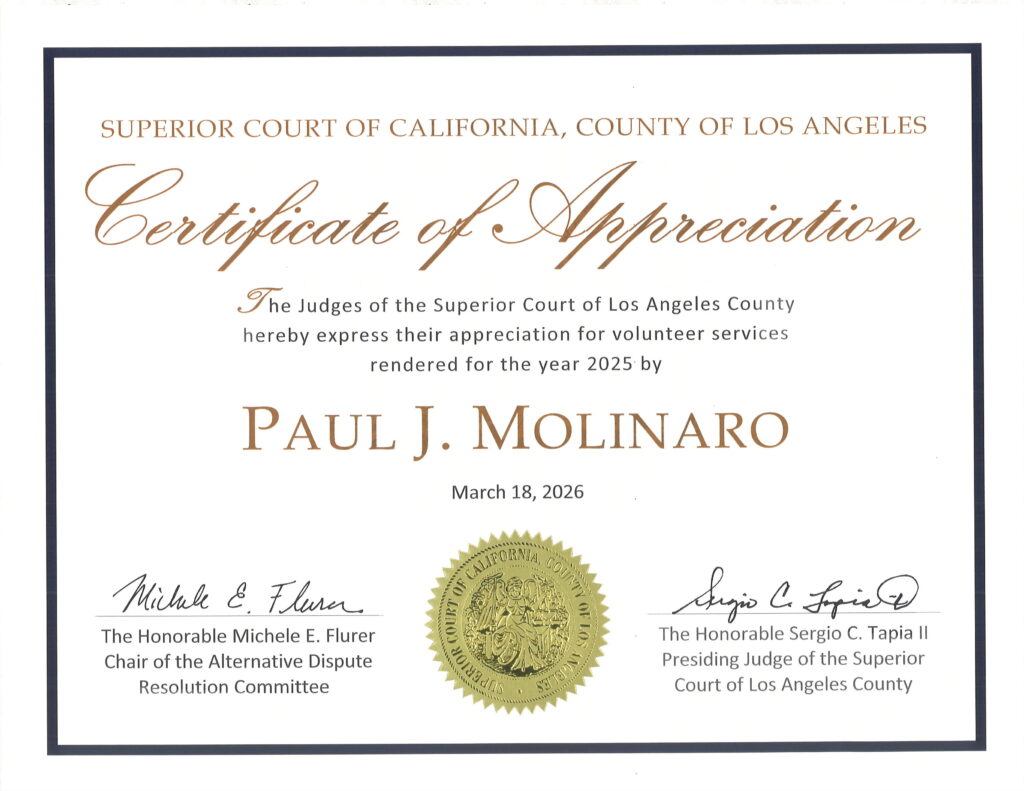 I just received a silver lapel pin for doing 32 volunteer mediations for the LA MVP (volunteer mediation panel) in the last 12 months. The requirement for silver was 25 or more mediations in the last 12 months. This means I have to step up my game to get the gold pin which requires 50 mediations or more in 12 months. In my defense (what kind of mediator would I be if I did not see both sides), I volunteer for several courts and I have a private mediation practice. Oh, and the morning of the ceremony, I was also part of a panel on personal injury mediation and it gave attendees one hour of CLE credit.